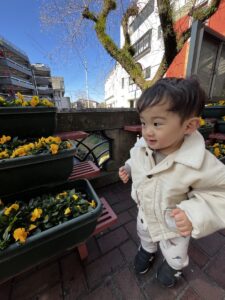 15日(日)、久しぶりに孫とゆっくり散歩する時間がとれました。ゆっくりと言っても、しゃがんで花や木切れ、石ころを見たり、握ったりして、立ち上がったと思ったら即ダッシュ。車道の脇の歩道を歩いていたので、冷や冷やです。最初は二人きりの散歩だったので泣きはしないかと心配していましたが、人見知りより散歩のうれしさが勝っていたようで、いつもの散歩コースを全く疲れを見せずに歩き(走り)つづけました。小さい体なのに凄いスタミナです。「あか、あお、きいろ、おはな、きれい、かわいい、はっぱ…」などなど、話せる言葉も増えていてびっくりしました。次は、広い公園などでゆっくり散歩を楽しみたいなと思っています。