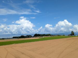 写真は先週、少し高台にある小浜の現場近くで撮ったものです。「県内にもこんなに広々とした景色が見られる場所があったんだ」という感動を、携帯電話基地局を回っていると度々感じることができてうれしく思っています。